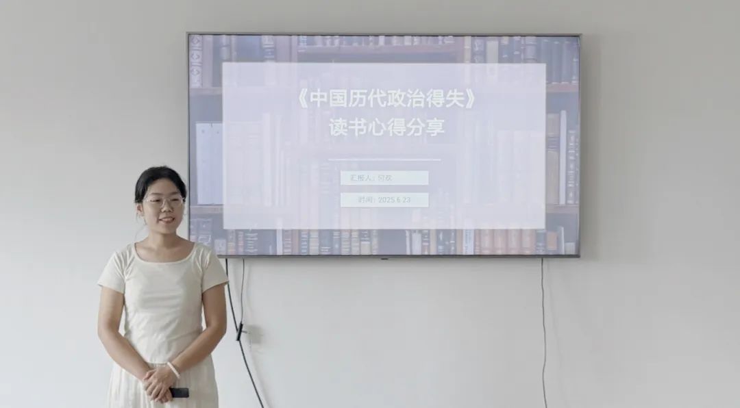 林美玉博士对何欢的读书分享进行点评。她认为何欢同学汇报主题明确,紧扣书籍核心观点展开,对《中国历代政治得失》的理解较为准确深刻。且结构清晰,从引入书籍到介绍内容、分析观点、阐述感悟,层层递进,逻辑连贯。分析有深度,能结合历史背景和现实情况进行思考,体现了一定的思考能力。同时指出,理解历史不仅要看到表面的事件,更要探究其背后深层次的社会观念和时代背景。这对于我们今后理解和把握现实政治,乃至未来的政治发展,都有着极为深刻的启示。