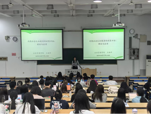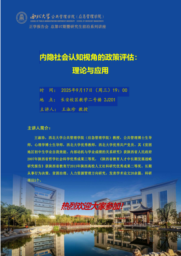 2025年9月17日晚7:00,西北大学公共管理学院王淑珍教授在多媒体教室为我院2025级全体硕士研究生作了题为“内隐社会认知视角的政策评估:理论与应用”的专题讲座。