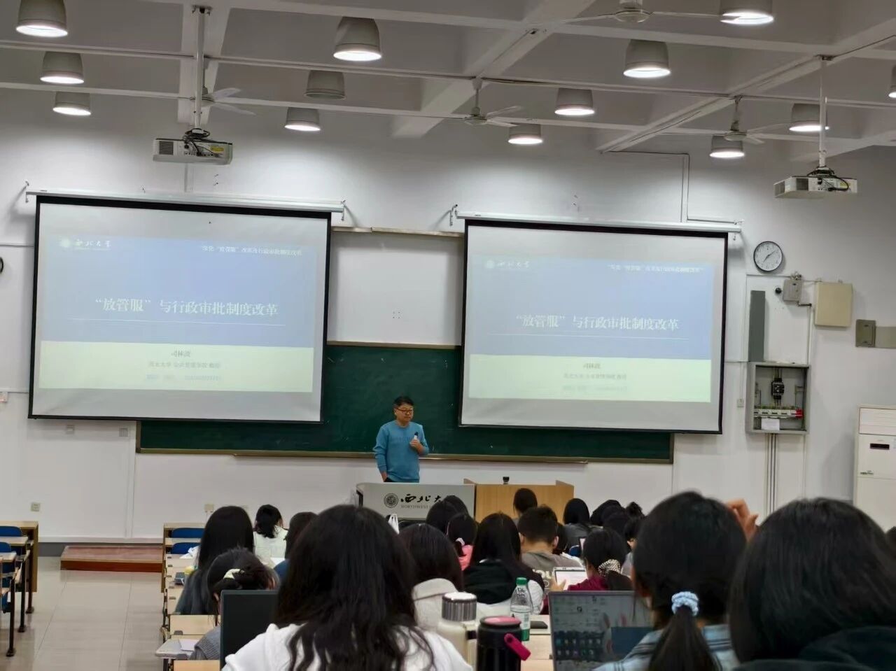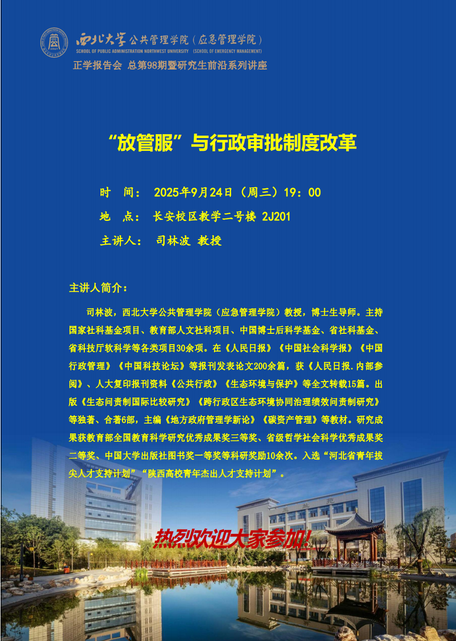 2025年9月25日晚19:00,西北大学公共管理学院司林波教授在2J201教室为我院2025级全体硕士研究生作了题为“放管服”与行政审批制度改革的专题讲座。
