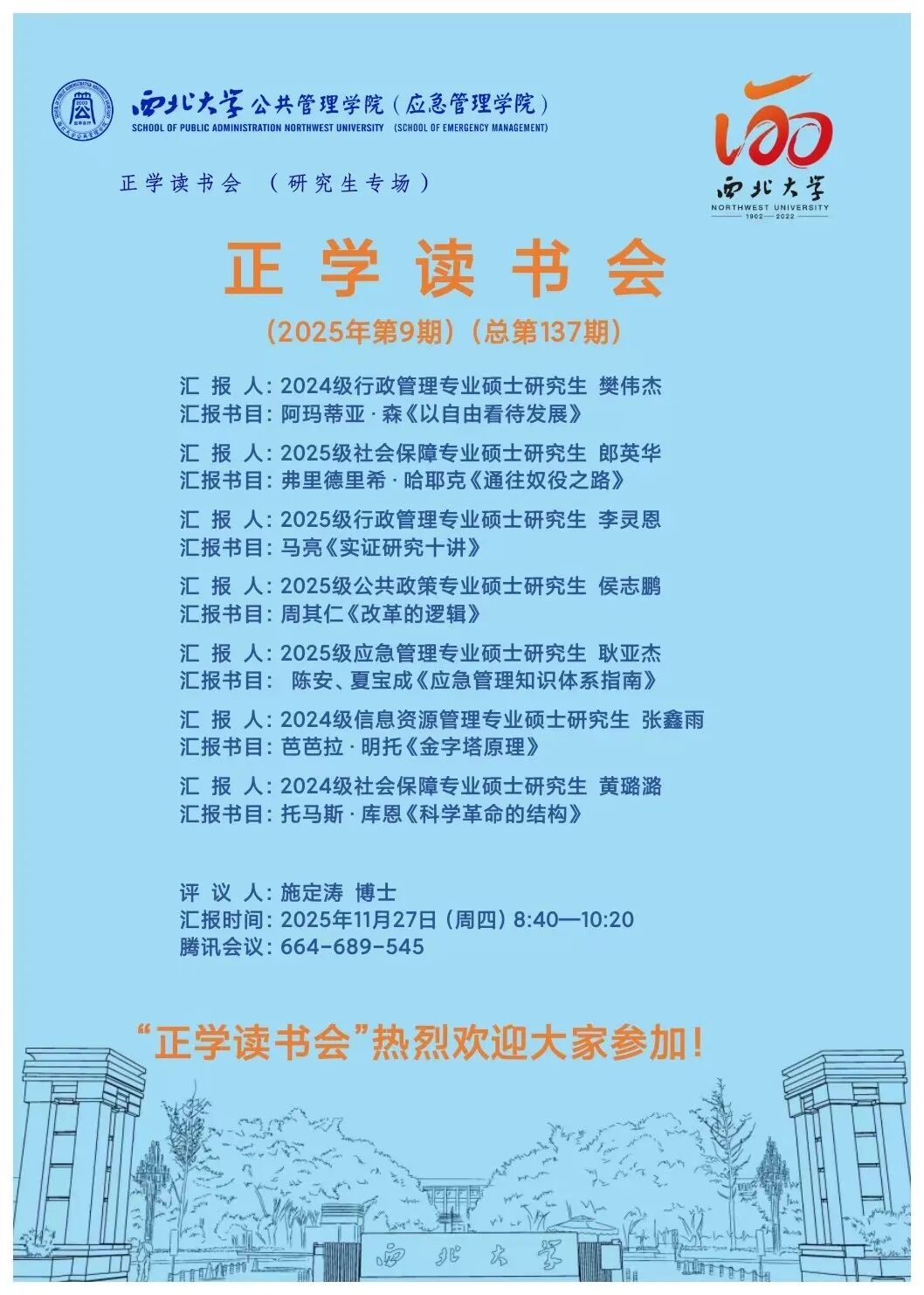 2025年11月27日,我院线上举办了2025年第9期正学读书会。西北大学公共管理学院2024级行政管理专业硕士研究生樊伟杰、2025级社会保障专业硕士研究生郎英华、2025级行政管理专业硕士研究生李灵恩、2025级公共政策专业硕士研究生侯志鹏、2024级信息资源管理专业硕士研究生张鑫雨、2024级社会保障专业硕士研究生黄璐潞、2025级应急管理专业硕士研究生耿亚杰分别作为主讲人进行读书汇报,公共管理学院2025级博士研究生施定涛担任评议人,部分研究生旁听了此次报告会。