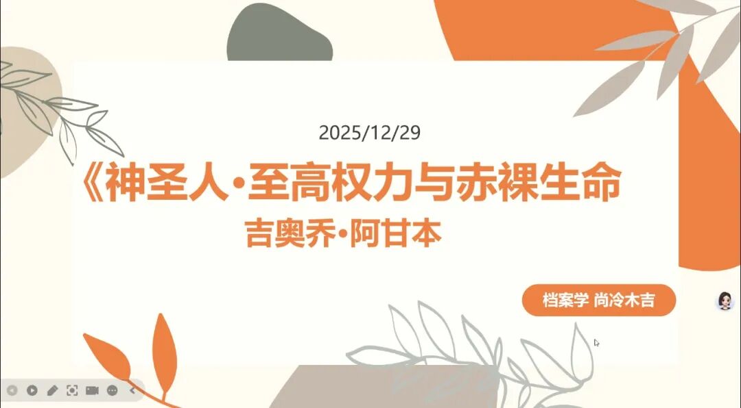 2024级档案学专业硕士研究生尚冷木吉分享了吉奥乔·阿甘本的《神圣人·至高权力与赤裸生命》。该著作是西方政治哲学批判的代表性文本,其未囿于制度表层分析,而是穿透至主权权力的运作逻辑与生命政治的生成机制,提出了“神圣人”“赤裸生命”及“例外状态”等影响深远的理论概念。分享中,尚冷木吉同学围绕作者思想背景、核心框架、关键概念、历史脉络、当代映照与理论局限六大维度展开系统论述,阐释了主权如何通过悬置常规法律、制造“例外状态”,将人从政治身份中剥离,还原为可被直接操控的“赤裸生命”,从而揭示现代权力对生命的双重机制——既将其纳入治理,又将其排除于保护之外。通过聚焦集中营、难民状态、反恐拘留及数字监控等现实情境,尚冷木吉同学具象化了理论对当代治理困境的解释力,尤其凸显了生命在技术政治时代被数据化、计算化与边缘化的风险。