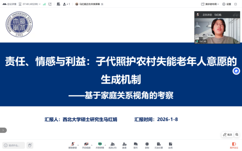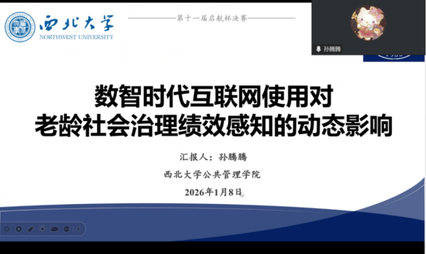 2026年1月8日下午,我院线上举办了西北大学公共管理学院第十一届“启航杯”征文大赛答辩会。此次答辩会特邀请到许俊宝、卢芳许和闫晓萌三位博士研究生担任评议嘉宾。会议由学院研究生会成员卜子桐主持,部分研究生旁听了此次会议。
