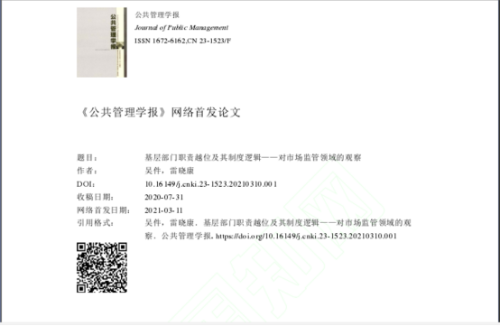 我院雷晓康教授任通讯作者,与清华大学吴件博士合作完成的论文《基层部门职责越位及其制度逻辑——对市场监管领域的观察》一文在《公共管理学报》2021年3月11日线上发表。本文认为基层部门职责越位更多是被动、非自愿的,且是多重制度间相互作用的系统结果。通过对市场监管领域的实地考察,表明基层市场监管部门职责越位多是被动和隐性的,是“耕了别人的地,荒了自己的田”。其背后的制度逻辑在于:首先,制度的属性变化,特别是监管职责属性、基层管理体制、部门性质的改变是职责被动越位的基础逻辑,深层逻辑指向权威体制与有效治理的关系;其次,职责被动越位的不同类型由不同的制度情景造就,“行政发包制”与压力加码制则提供了动力;最后,职责越位具有强化和扩张趋势,使职责越位逐渐常态化。本文的初步探索能完善政府职责越位的综合图景和中观层面的制度逻辑解释,为基层政府部门正确履职,职责正位提供一定的启示。