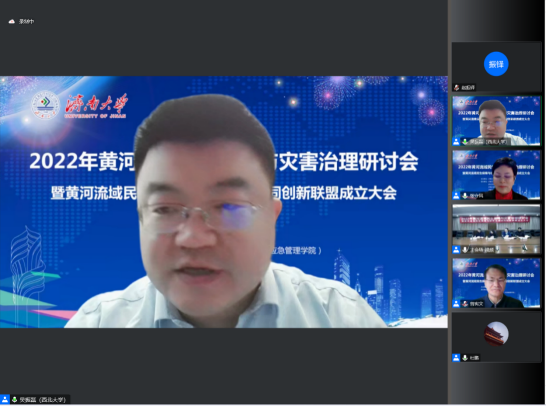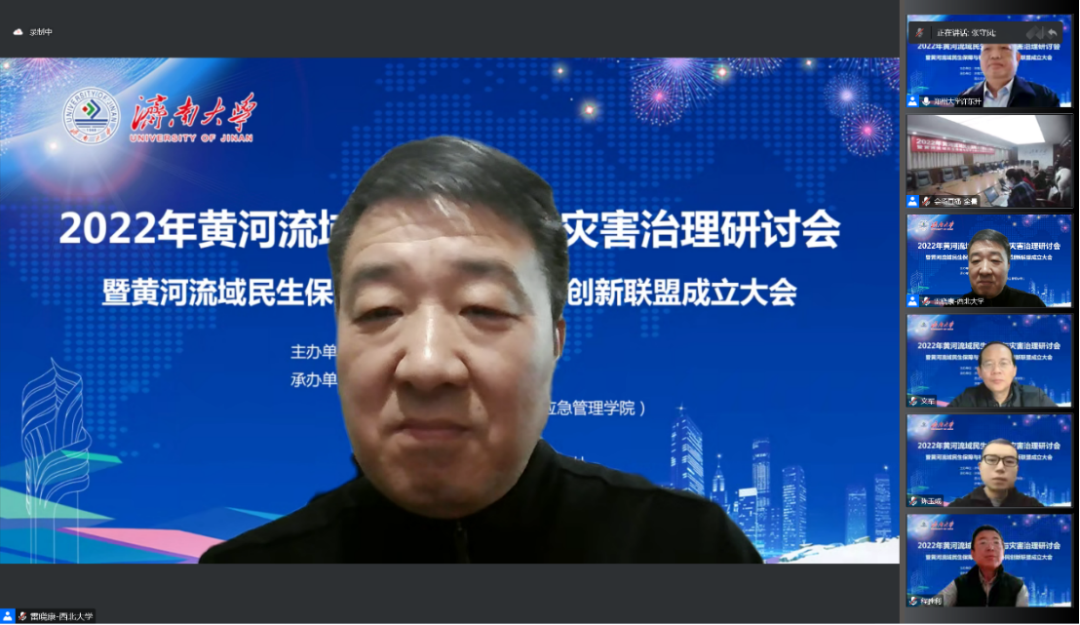 2022年12月10日,由济南大学与西北大学联合主办,济南大学政法学院、西北大学公共管理学院(应急管理学院)、济南大学社科处及济南大学发展规划与学科建设处联合承办,由新时代社会治理与政策创新研究基地(山东省社科理论重点研究基地)、民政部全国民政政策理论研究基地、计算社会科学与数字社会治理山东省高校文科实验室、中国老龄协会老龄科研基地、山东省人大常委会地方立法研究服务基地协办的“2022年黄河流域民生保障与灾害治理研讨会暨黄河流域民生保障与社会治理协同创新联盟成立大会”在腾讯会议线上举行,会议由《社会科学》、《山东大学学报》(哲学社会科学版)、《西北大学学报》(哲学社会科学版)、《南通大学学报》(社会科学版)、《济南大学学报》(社会科学版)提供学术支持。来自国家减灾委、中国行政管理学会、中国政治学会、中国社会保障学会、中国人民大学、武汉大学、山东大学、兰州大学、济南大学、西北大学、华中师范大学等50多家高校与研究机构的250余位专家学者和师生代表参加会议。