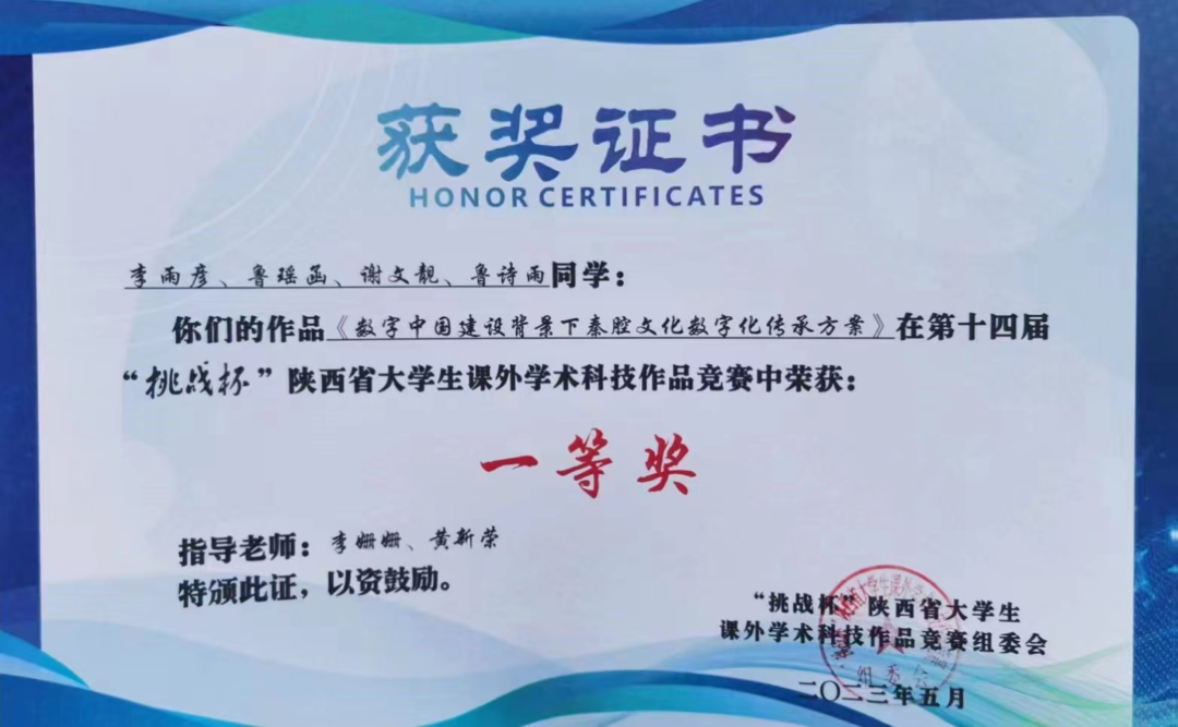 在我院档案学专业李姗姗老师和黄新荣老师指导下,由2020级档案学专业本科生李雨彦、鲁瑶函、谢文靓及2020级人力资源管理专业本科生鲁诗雨参与完成的《数字中国建设背景下秦腔文化数字化传承方案》项目喜获省赛一等奖。