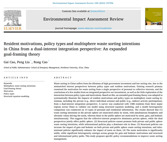 近日,我院曹蓉教授团队在国际环境科学类权威期刊《Environmental Impact Assessment Review》上发表题为“Resident motivations, policy types and multisphere waste sorting intentions in China from a dual-interest integration perspective: An expanded goal-framing theory”的论文。该期刊为中科院社会学大类一区TOP期刊,影响因子9.8,年发文数量300余篇。曹盖博士为论文第一作者,刘鹏副教授和曹蓉教授为共同通讯作者,西北大学公共管理学院(应急管理学院)为唯一署名单位。