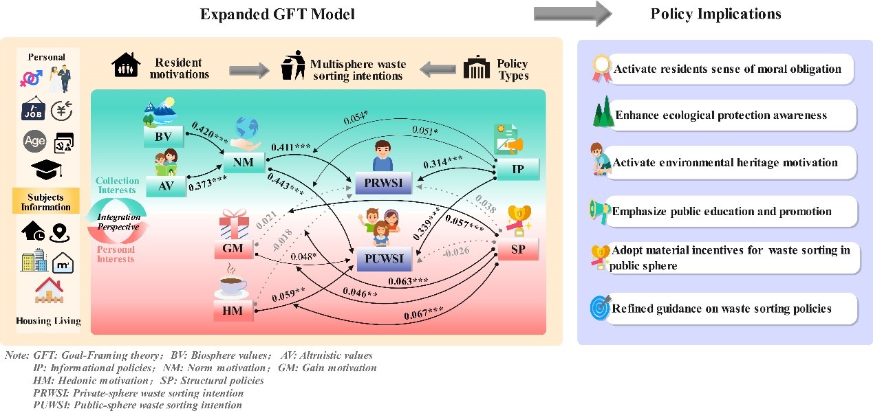 本研究采用了扩展的目标框架理论,从双重利益整合视角系统地阐述了居民动机和政策类型对多场域垃圾分类意愿(包括私人场域(如直接个人垃圾分类行动)和公共场域(如间接垃圾分类活动参与))的影响。结果发现,(1)私人场域的垃圾分类意图仅由规范动机驱动,同时生物圈和利他主义价值观驱动规范动机,而公共场域则由规范、获益和享乐动机共同驱动。表明集体利益视角主导私人场域,而集体和个人利益双重视角共同影响公共场域;(2)相较于结构政策,信息政策在多场域垃圾分类意愿中起主导作用;(3)结构政策和信息政策对于双重利益视角对多场域垃圾分类意愿分别起调节作用;(4)对居民画像(13种个人和住宅信息)进行了12条路径的模型同步对比,发现规范动机显著稳定,而不同群体在个人利益视角以及政策类型的路径上出现了显著的异质性。据此,本研究为垃圾分类管理提出了政策建议。