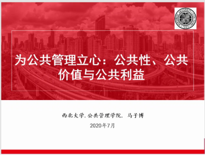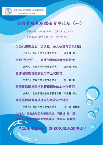 2020年7月12日19:00至22:00点,西北大学公共管理学院(应急管理学院)举办了第9期“正学研讨会”——“公共管理基础理论青年论坛(一)”。本次研讨会有5个报告,报告人分别是我院马子博博士、卫知唤博士、孙峰副教授以及来自中南大学的何雷博士和来自北京师范大学的李亚鹏博士。本次研讨会的主持人是我院司林波教授,评议人是何君安副教授。会议伊始,司林波教授首先对我院所举办的“正学研讨会”以及本次会议的报告人进行了介绍。本次研讨会聚焦于公共管理基础理论,5位主讲人围绕公共管理的公共性、治理理论以及政策议程三个研究主题进行报告。来自南京大学、西南交通大学、西南财经大学、南京工业大学、华东政法大学、广西民族大学、华北电力大学、燕山大学、长安大学、西北政法大学、西北大学等校内外的150余位师生参加了这次研讨会。