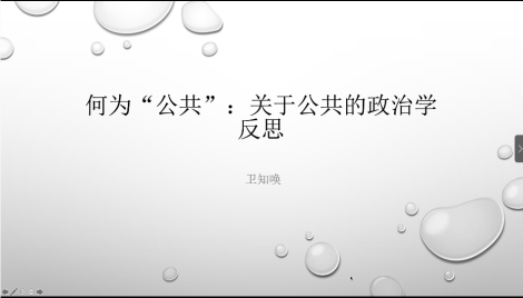 卫知唤博士围绕“何为‘公共’:关于公共的政治学反思”这一主题展开了讨论。他首先从当前对“公共”一词的滥用入手,对众多冠以“公共”名义的现象进行了列举,然后分别从五个视角出发对“公共”进行考察,一是从共同体考察公共,二是从私有权考察公共,三是从历史社会学以及政治学考察公共,四是从社会领域分化看公共,五是从社会演化领域看公共,然后以批判性的视角介绍了古典共和主义、放任自由主义以及社群主义关于公共的观点。最终,卫知唤博士得出了自己关于公共的研究结论:第一,在追寻公共的时候,不要忘记社会不平等的基础;第二,允许权力支配的同时,构建由约束力的公共;第三,在历史的角度,追求现实的,有层次的公共目标;第四,把公共视为努力的目标,而非理论的起点。