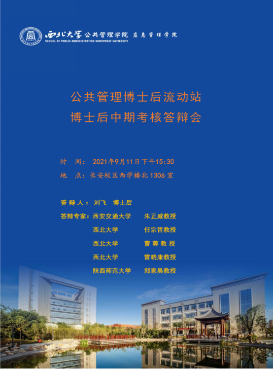 2021年9月11日下午,在西北大学公共管理学院(应急管理学院)1306会议室举行的博士后中期考核答辩顺利展开,此次博士后中期考核小组由西安交通大学朱正威教授任专家组主席,成员包括西北大学任宗哲教授、曹蓉教授、雷晓康教授以及陕西师范大学郑家昊教授。西北大学公共管理学院(应急管理学院)刘飞博士后对进站后的工作成果和下一步设想作了汇报。
