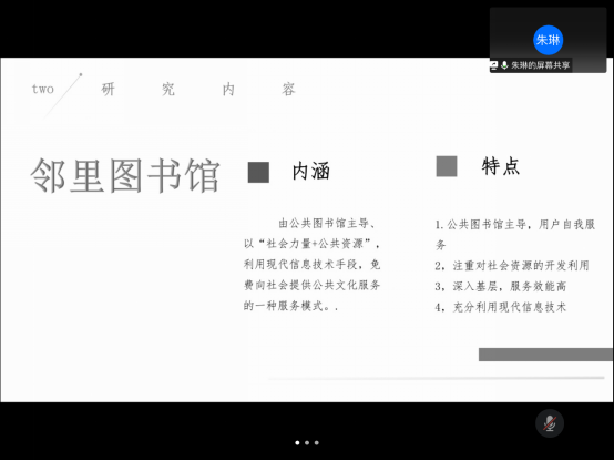 首先,朱琳同学作了关于邻里图书馆相关研究的汇报,认为邻里图书馆是公共图书馆创新服务模式的成功探索,其实践过程中充满社会互动性;结合图书馆学五定律、长尾理论、新公共服务理论从理论的角度对邻里图书馆进行分析,加深对邻里图书馆现实意义的全面理解,同时提出推动邻里图书馆可持续发展的建议。王铮老师随后作了简要点评:在做邻里图书馆理论研究中,要以问题为导向,体现研究中需要的理论支撑。要将三个理论与邻里图书馆实践紧密结合过程中,注意要使佛山市邻里图书馆的经验更具有普适性。