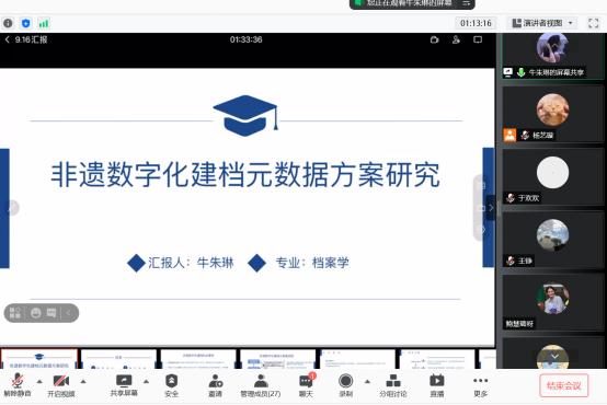 牛朱琳同学汇报的题目是《非遗数字化建档元数据方案研究》,主要汇报了元数据方案的研究设计及目前进度,分别从用户访谈、资源分析、初步方案三个方面展开汇报。首先,在访谈部分介绍了访谈人群类型及提纲,通过预访谈结果分析用户需求;其次,介绍了非遗数据库现状及对传统技艺非遗类目的资源分析结果;然后,在访谈结果和资源分析的基础上建立了初步元数据方案。汇报的最后对后期研究作出详细的规划。王铮老师对此提出三点建议:一、后续文章中要注意理论基础的体现;二、用发现问题、分析问题、解决问题的逻辑进行整体研究;三、用文字把目前所做工作进行完善。