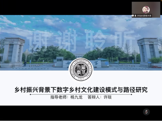 许琰同学的汇报题目是《乡村振兴背景下数字乡村文化建设模式与路径研究》,主要从选题背景、研究内容、日后规划三个方面进行了汇报。首先,从时代背景、政策依据、现实维度三个方面对选题背景进行了介绍;其次,详细介绍了其研究的内容、目前的进展、以及筛选后选取的六个具体案例。最后,计划从实地调研即与六个具体案例相关的工作人员进行深度访谈,以及依照调研结果和新出台政策得出结论两个方面继续完善本研究。王铮老师对该选题表示了肯定,同时建议:一积极与和自己使用相同研究方法的同学交流学习;二是在未来的研究及写作中要结合乡村振兴背景,同时与政策中明确指出的发展实践要求紧密结合起来。