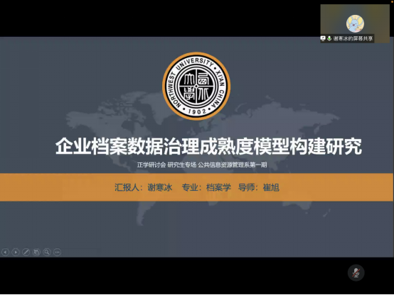 谢寒冰同学着重分享了她在《企业档案数据治理成熟度模型构建研究》这一课题中使用的研究方法,主要是专家访谈法、问卷调查法、总分比重法。特别介绍了总分比重法的优点是,总分比重法可以计算出专家对某个指标回答人数的比例,通过给某个意见设置重要性排序的方式设计问卷便于专家理解和判断,得到更加可靠的意见。在此基础上构建出企业档案数据治理成熟度模型,得出研究结论:在“十四五”规划与档案治理体系现代化的大浪潮推动下,企业档案数字化转型面临着巨大的危机与挑战,企业亟需一个完善且行之有效的评估方法,来测评自身的档案数据治理水平与质量,并根据此方法形成可靠的档案数据治理持续优化方案,来推进企业提升档案数据资产意识,实现档案数据治理标准化、规范化、制度化、现代化。