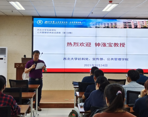 2021年9月24日,由社科处、宣传部与公共管理学院(应急管理学院)联合主办的西北大学人文社科名家讲坛暨公共管理学术前沿讲座(第138期)在我校长安校区公共管理学院(应急管理学院)多媒体教室举行。中国社会学会副会长、华中农业大学二级教授、博士生导师钟涨宝为我校师生作了题为“乡土重建思想对当代中国实施乡村振兴战略的启示”的学术报告。报告由公共管理学院(应急管理学院)院长雷晓康教授主持。报告现场座无虚席,百余名师生听取了报告。