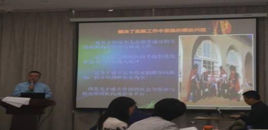 民政厅救灾处姜文学对2015年8月提出的《支持引导社会力量参与救灾工作的指导意见》进行解读,他叙述了社会力量参与救灾的特点如参与积极性高、做出很大贡献、自身不断发展壮大、暴露了一些问题,同时指出该指导意见中的亮点:一是明确不同阶段社会力量参与救灾的内容;二是搭建社会力量参与救灾的服务平台;三是加大对社会力量参与救灾工作的支持力度;四是强化支持引导社会力量参与救灾的信息导向作用。该指导意见解决了实际工作中面临的一些问题。此外,他还讲到了陕西省关于社会参与救灾的政策意见。政策创设方面,鼓励大专院校、科研院所、志愿者参与救灾,同时,搭建减灾平台。最后他总结了社会力量参与救灾过程中取得的成就。