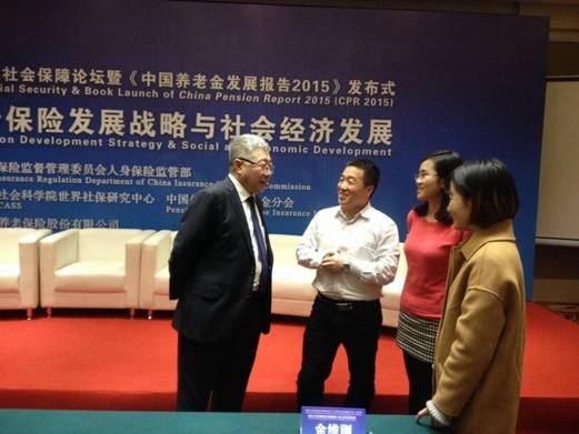 中国社会科学院社会保障论坛暨《中国养老金发展报告2015》发布式于2015年12月26日在北京召开,我院雷晓康教授、社会保障硕士研究生常沁芮、汪玮一同参加了此次会议。今年的主题是“商业养老保险发展战略与社会经济发展”。在主题报告“商业养老保险发展战略:顶层设计与模式选择”中,社科院的研究团队分析了全球福利体制三类模式中商业养老保险的作用,提出了我国实行“多层次混合型”养老保障体系的发展道路,认为商业养老保险的地位亟需加强,这是新时期实现经济社会转型、储蓄和消费结构调整的现实需要,是资本市场健康发展的现实需要,是优化家庭财富结构的现实需要;提出了延税型商业养老保险需建立在个人账户基础之上,账户是第三支柱的支撑平台的观点;提出了商业养老保险五个功能定位的基本思路。