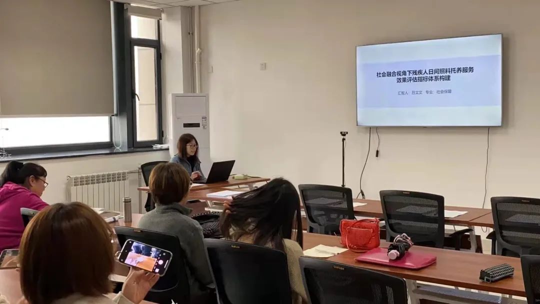 2020级社会保障专业研究生吕文文同学汇报的论文题目是《社会融合视角下残疾人日间托养服务效果评估指标体系构建》,她主要从问题的提出、社会融合视角下残疾人日间照料托养服务效果评估指标体系的构建以及构建的该指标体系的实践价值等方面展开阐述,重点对残疾人社会融入指标的划分维度以及社会融合视角下残疾人日间照料托养服务社会效果的评估指标体系做了分析。