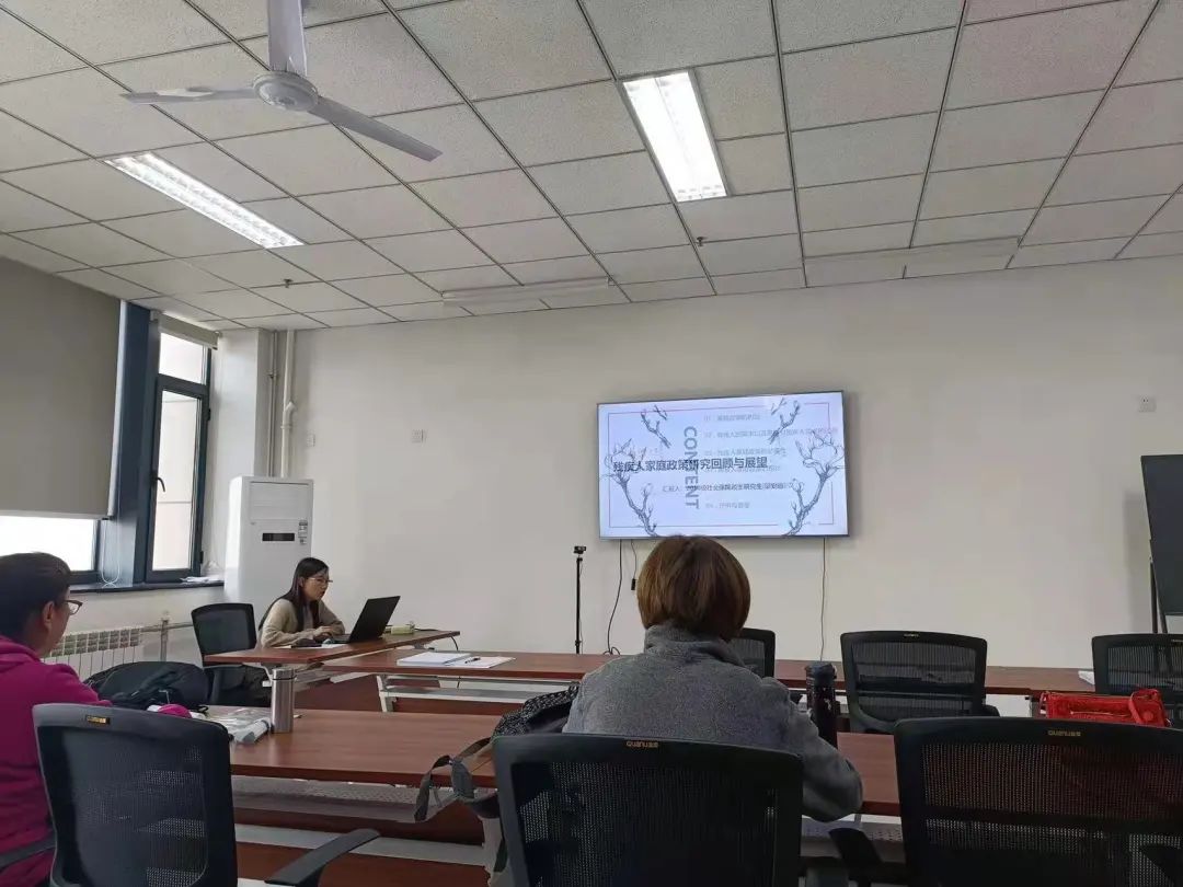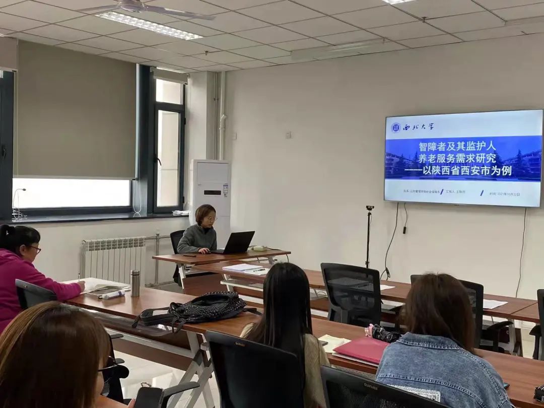 2020级社会保障专业研究生王静玥汇报的题目是《智障者及其监护人养老服务需求研究——以陕西省西安市为例》,她结合自己在导师课题组调研的收获对研究背景与研究内容展开了详细汇报,对智障者及其监护人的养老服务需求提出了自己的看法。