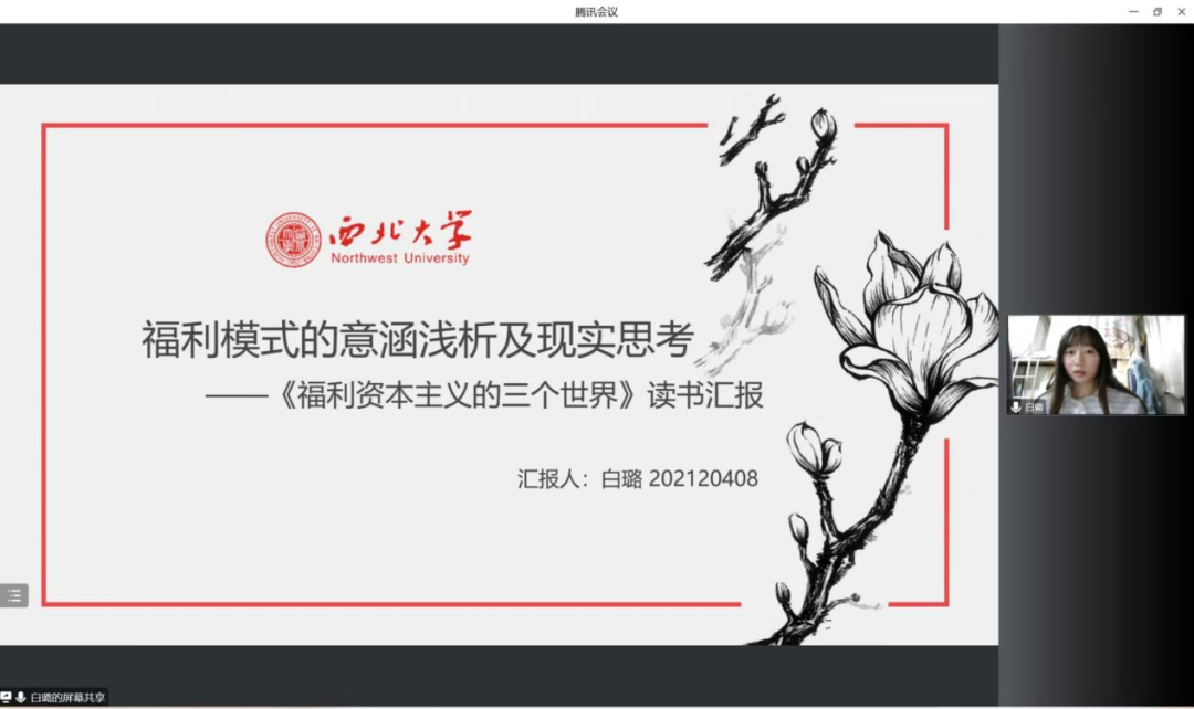 2021级社会保障专业硕士研究生白璐分享的书目是艾斯平·安德森的经典著作《福利资本主义的三个世界》。白璐同学从福利模式的意涵切入,梳理了《福利资本主义的三个世界》的思路框架,从艾斯平·安德森与《福利资本主义的三个世界》、内容结构、学术贡献与不足以及现实思考四方面展开汇报。首先将全书内容整理为两个分论点,从不同福利模式的差异性及根源、福利模式对经济社会的决定性影响两方面做以具体说明。其次,对于本书的学术贡献和不足之处做以说明,指出其学术贡献在于开创了新的视角以及在研究中起到了承上启下的作用,另一方面也在理论构建和研究方法上均存在着部分缺陷。最后,围绕我国的福利体系构建展开了探讨,提出要在养老、医疗、教育、住房等基本民生问题上形成基本的社会保障网,把各项社会福利权利义务纳入正式法律,还要将公民社会权利意识的培养纳入各级教育体系中。