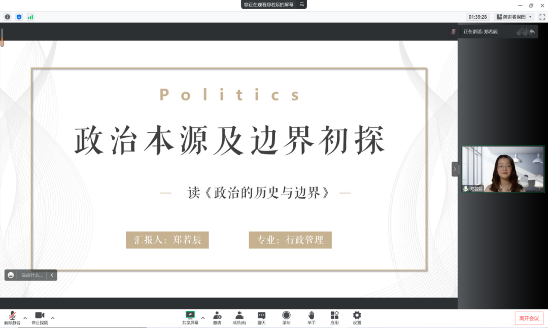 2021级行政管理专业硕士研究生郑若辰分享的书目是肯尼斯·米诺格的经典著作《政治的历史与边界》。她为大家分享了本书的核心内容与对本书的思考。首先她从塑造今天西方现代政治结构的三大历史——希腊文明、罗马文明、希伯来文明出发,为大家介绍了政治发展的历史脉络。随后着重探讨了正义、自由、民主三种价值,并从政治的边界出发,厘清了政治与专制、政治与意识形态的区别。最后,她与大家分享了阅读本书的感悟:我们对政治的理解已经成为一种工具上的意义,政治或者国家本身不是目的,它是手段,它是实现个人保障的一种手段,我们需要在价值、立场的对立间寻求共识,这也是本书的一个核心观点——政治的精髓就是不同见解之间的争辩。