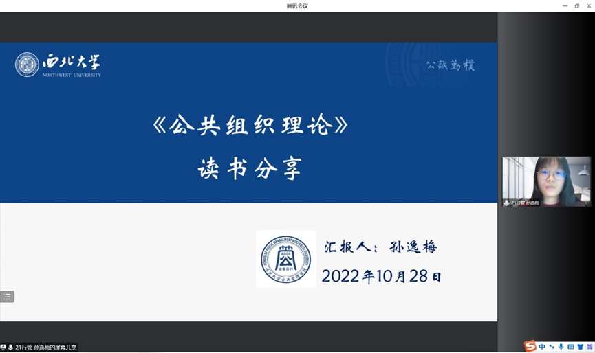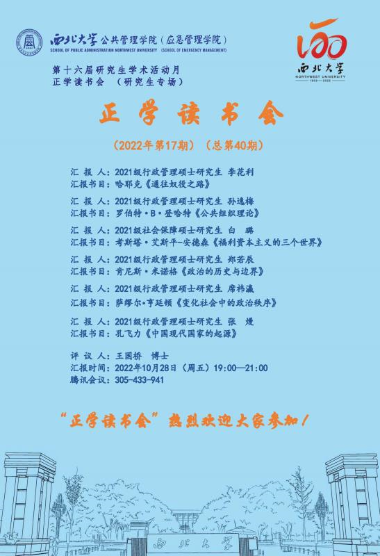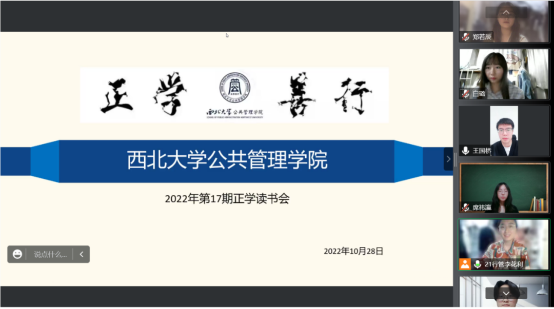 20221028日下午,我院线上举办了2022年第17期正学读书会。2021级行政管理硕士研究生李花利、2021级行政管理硕士研究生孙逸梅、2021级社会保障硕士研究生白璐、2021级行政管理硕士研究生郑若辰、2021级行政管理研究生席祎瀛、2021级行政管理硕士研究生张熳分别作为主讲人进行读书汇报,公共管理学院2021级博士研究生王国桥担任评议人,部分研究生旁听了此次报告会。