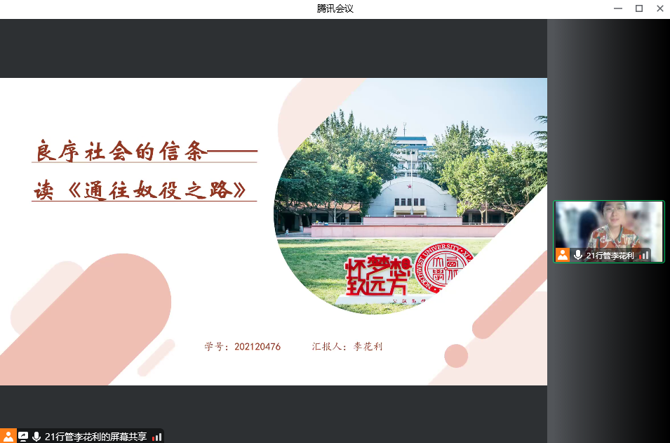 2021级行政管理专业硕士研究生李花利分享的书目是哈耶克的《通往奴役之路》,她从作者简介、创作背景、内容概述、核心观点以及对本书中哈耶克观点的评析这五个方面进行分享。本次汇报在对哈耶克《通往奴役之路》一书篇章结构分析的基础上,从作为分析对象的社会主义、集体主义与文明毁灭、战后英国面临的危险和国际联邦与政治理想这四个部分梳理本书的主要内容,并结合《大转型》对每一部分提出自己的观点和思考。最后,总结了自己的观点,提出了一些疑问,并反思了本书的理论与现实意义。