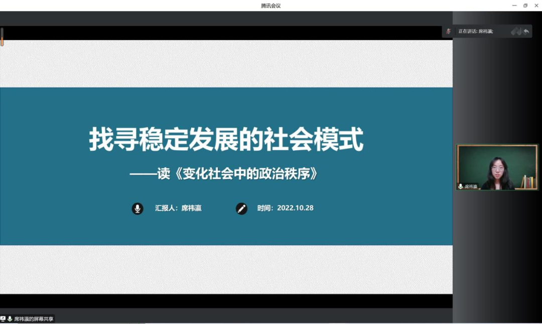 2021级行政管理专业硕士研究生席祎瀛同学分享的书目是塞缪尔·亨延顿所著的《变化社会中的政治秩序》。她围绕政治差距、政治制度、政治参与、城乡差距、政治稳定、普力夺社会六个概念展开分享,介绍了作者所述的现代化中政治秩序的稳定和政治衰朽、政治现代化的表现。随后,详细讲述了政治秩序的构建过程(普力夺社会形态的演变)、建立政治秩序的手段(革命和改革)以及政党组织在政治秩序中的重要作用。最后,根据我国实际,结合亨廷顿在本书中提到的相关内容做以解读,分享自己的思考。