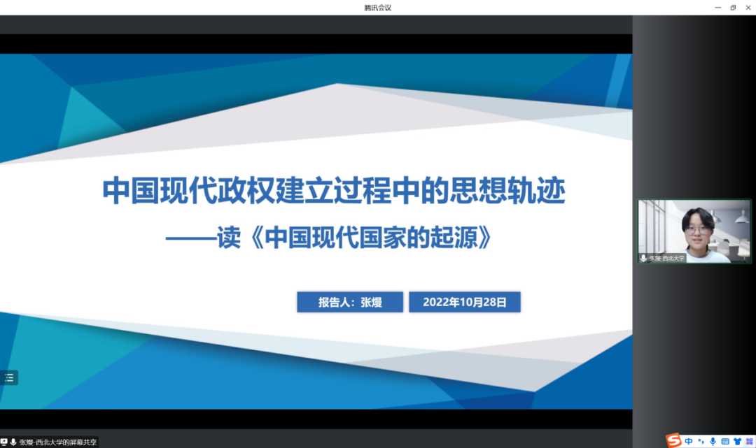 张熳同学所介绍的书目是《中国现代国家的起源》,她从阅读原因与作者简介、主要问题与写作逻辑、具体内容及阅读感悟三个方面作分享报告。张熳同学谈到,作者孔飞力试图以一个分享者的视角,与我们探讨这样一个宏大的命题:“宪政民主的理念是否有可能在中国自发产生?或者说,清末帝制的政治思想是如何逐步转变为民初的宪政民主理念的?”她认为本书以四个历史片段为线索,将时间卷轴缓缓打开,叙述了几代人在中国现代国家形成中所扮演的角色以及各类推动力量。汇报中,她以政治参与、政治竞争、政治控制为切入点,以人物思想与背景事件为核心,串联起本书的“中国现代政权建立过程中的思想轨迹”。