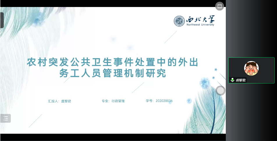 2020级行政管理专业硕士研究生虞黎君同学的汇报题目为《农村突发公共卫生事件处置中的外出务工人员管理机制研究》,本研究立足于突发事件频发、农村地区是突发公共卫生事件防治的重点和短板的研究背景下,指出了农村疫情防控过程中对外出务工人员进行管理的必要与刻不容缓。在对农村突发公共卫生事件处置中的多重角色参与者、促进者、阻碍者、受益者进行分析后,研究认为农村突发公共卫生事件处置中存在着外出务工人员分散性、返乡时间不可预期、信息隐瞒倾向、聚集性的管理困境。在此基础上,研究构建了农村突发公共卫生事件处置中外出务工人员管理的信息沟通机制、身份核查机制、健康监测机制、救治隔离机制、隔离保护机制、网格负责机制、实施保障机制的机制框架,最后针对不同的管理机制提出了相应的实现路径。