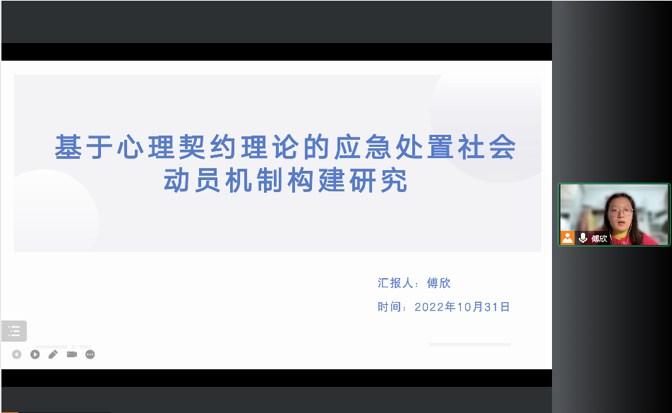 2020级行政管理专业硕士研究生傅欣同学的汇报题目为《基于心理契约理论的应急处置社会动员机制构建研究》,她在介绍心理契约的概念后指出了政府与民众之间的心理契约是指双方关系中存在的一系列的彼此期待的主观信念,是双方相互期望的集合。在此基础上,研究认为心理契约理论在应急社会动员中应用的可行性和必要性主要体现为平衡的心理契约可以激发人内在的积极性、进而可以增进组织间的认同、进而可以促进工作效率,最后可以降低生命财产安全风险。根据应急处置中的问题,本研究建立了应急处置社会动员的信任机制、激励机制、协调机制、宣传机制的机制框架,并由此提出了政府为主、多元主体协同合作、建立信任保障体系、设立奖惩制度、重视参与者心理建设、建立长效心理救助机制的的应急处置社会动员机制的构建路径。