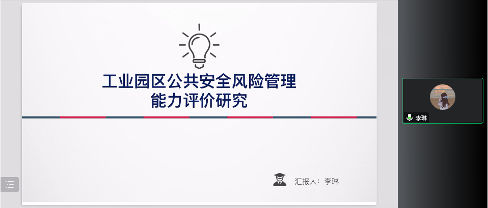 2020级行政管理专业硕士研究生李琳同学的汇报题目为《工业园区公共安全风险管理能力评价研究》,研究以预设在文献梳理与前期问卷调研的基础上构建工业园区公共安全风险管理能力的评价指标体系,再利用专家打分法对指标进行筛选以及利用层次分析法构建判断矩阵以确定指标权重,最后形成工业园区公共安全风险管理能力的评价模型。在生产安全事故频发的形势倒逼、提高安全生产水平的内在需求、开展工业园区公共安全风险管理能力评价的发展趋势的研究背景下,结合陕西省X工业园区的实际情况对评价结果进行分析,继而提出具有普遍性的工业园区公共安全风险管理能力提升的对策建议,对于全面风险管理理论运用、工业园区公共安全风险管理能力评价具有理论意义与实践意义。