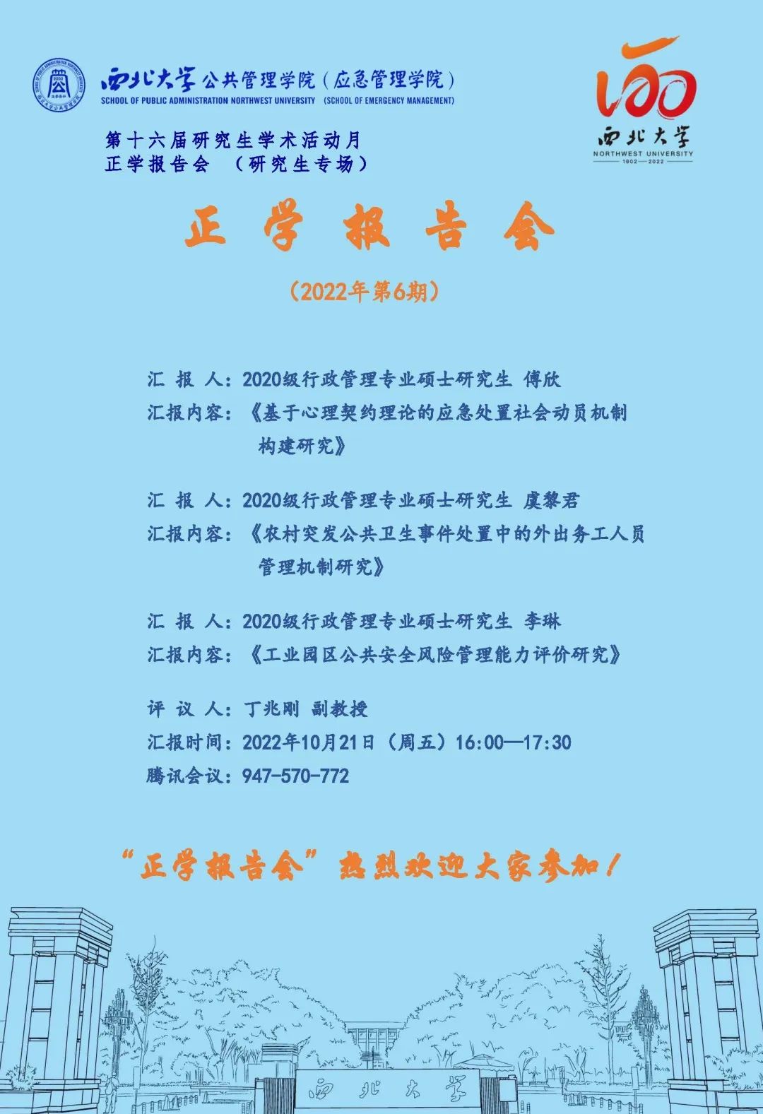 2022年10月21日下午,我院线上举办了2022年第6期研究生专场正学报告会。2020级行政管理专业硕士研究生傅欣、虞黎君和李琳分别作为主讲人进行专题学术汇报,丁兆刚副教授担任评议人,部分研究生旁听了此次报告会。
