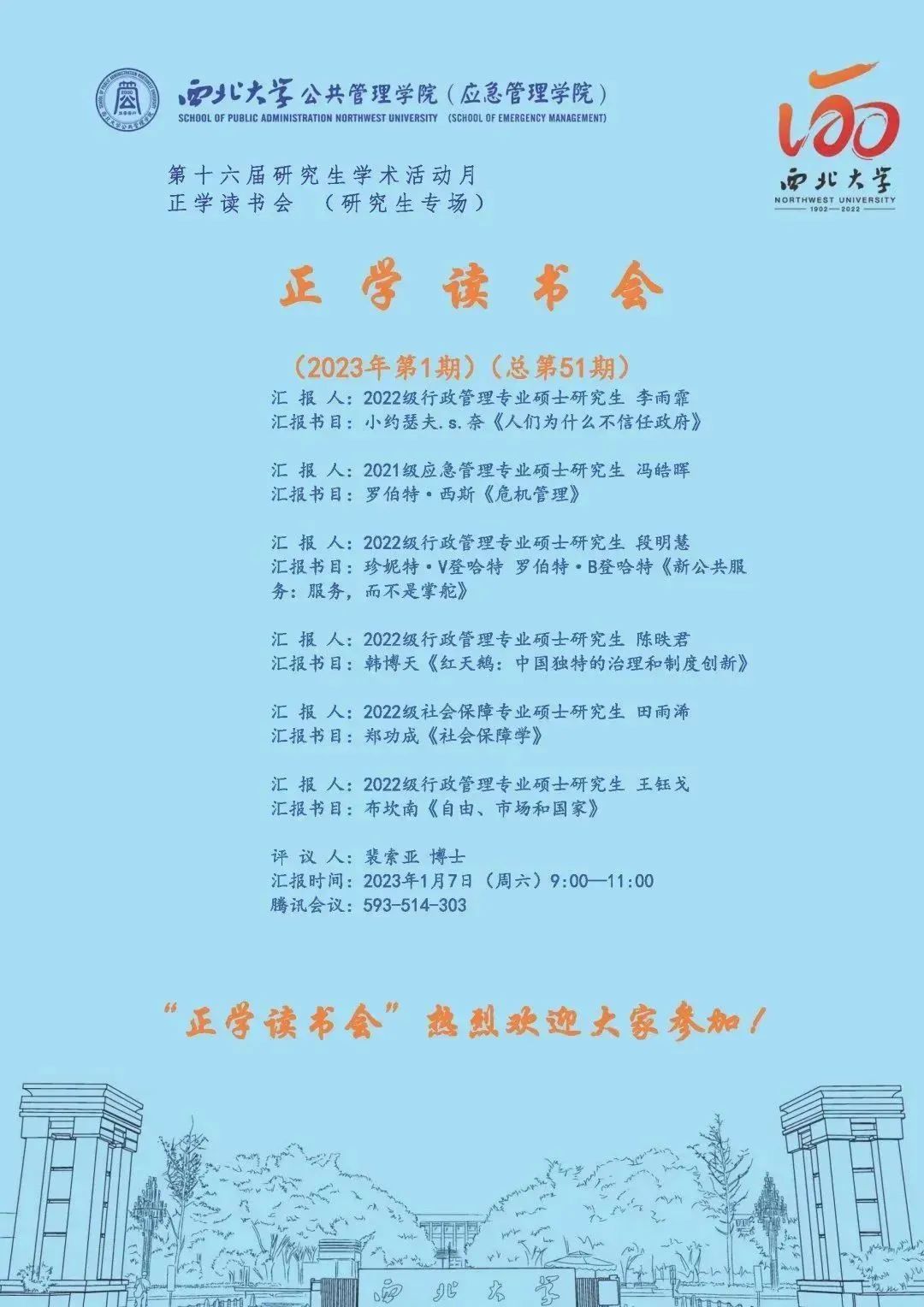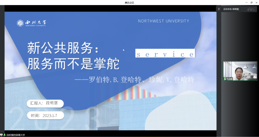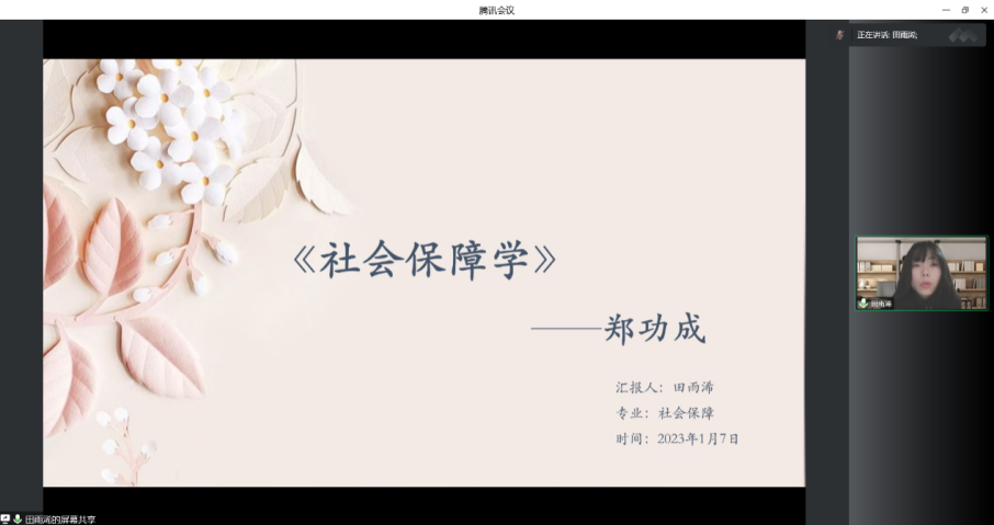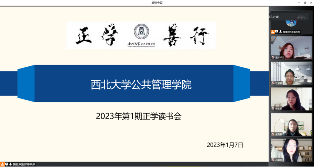 2023年1月7日上午,我院线上举办了2023年第1期正学读书会。2022级行政管理专业硕士研究生李雨霏、2021级应急管理专业硕士研究生冯皓晖、2022级行政管理专业硕士研究生段明慧、2022级行政管理专业硕士研究生陈昳君、2022级社会保障专业硕士研究生田雨浠、2022级行政管理专业硕士研究生王钰戈分别作为主讲人进行读书汇报,公共管理学院2022级博士研究生裴索亚担任评议人,部分研究生旁听了此次报告会。