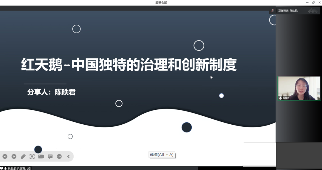对于陈昳君同学的分享汇报,裴索亚博士作出了点评。首先她指出,陈昳君同学思路清晰,逻辑严谨,总结了一种新的中国的治理模式,即红天鹅模式。同时,裴索亚博士也提出了自己对本书的看法,她认为作者并没有以西方经济学的主流观点来思考这样中国的这种治理行为,而是经过了深入的研究和分析之后,做了一次全新的归纳和总结。