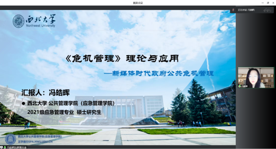 2021级应急管理专业硕士研究生冯皓晖汇报了罗伯特·西斯的《危机管理》,她从作者简介、著作背景与目的、逻辑思路与框架、主要内容与观点、理论应用五个部分进行了分享。首先,冯皓晖同学明确了危机管理的概念,指出危机管理包含对危机事前、事中、事后所有方面的管理,并用4R模式有机整合危机管理的四个方面,即缩减(reduction)、预备(readiness)、反应(response)、恢复(recovery),并延展了4R模式的结果--恢复力 (Resilience)。其次,她介绍了其他代表性的公共危机管理过程与阶段理论。最后,她通过分析上海外滩踩踏事件中政府新媒体的4R管理,展示了新媒体时代危机管理4R模型在政府公共危机管理中的应用。针对冯皓晖同学的汇报内容,裴索亚博士作出了点评。她认为通过学习《危机管理》,应进一步思考危机管理、风险管理、应急管理三者区别,进一步思考危机管理4R理论与其他公共危机管理过程与阶段理论的区别,应通过对书中内容进行延伸拓展并学以致用,深刻理解危机管理的真正含义。