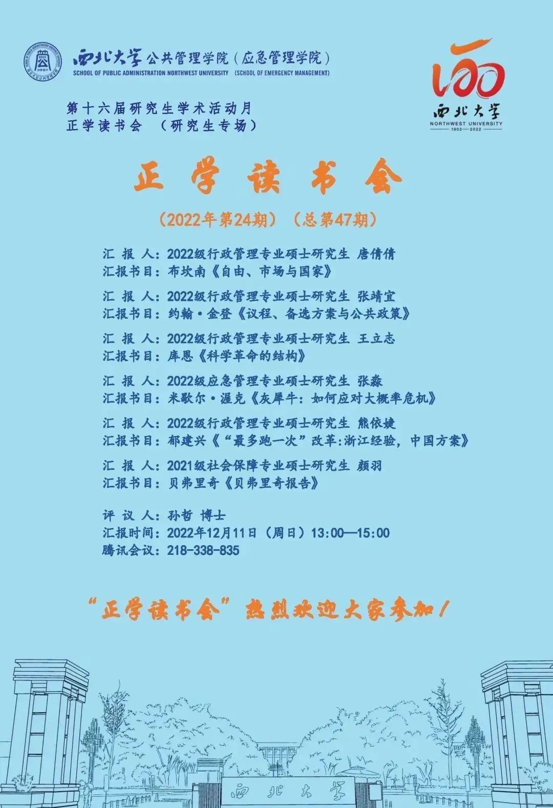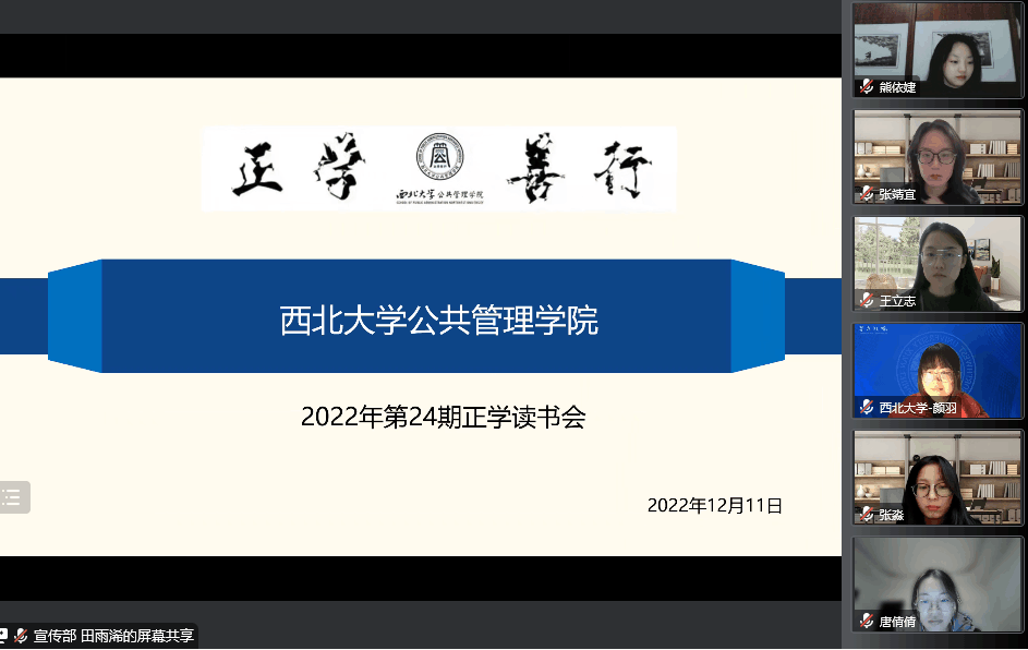 2022年12月11日下午,我院线上举办了2022年第24期正学读书会。2022级行政管理专业硕士研究生唐倩倩、2022级行政管理专业硕士研究生张靖宜、2022级行政管理专业硕士研究生熊依婕、2022级行政管理专业硕士研究生王立志、2022级应急管理专业硕士研究生张淼、2022级社会保障专业硕士研究生颜羽分别作为主讲人进行读书汇报,公共管理学院2022级博士研究生孙哲担任评议人,部分研究生旁听了此次报告会。