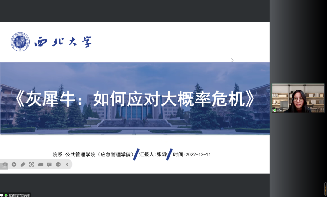 2022级应急管理专业硕士研究生张淼分享的书目是米歇尔·渥克的《灰犀牛:如何应对大概率危机》。她从作者与著作简介、逻辑思路与框架和个人阅读感悟三个部分展开汇报。首先她介绍了本书及其作者的基本情况。接着,她将本书的逻辑框架划分为三个部分进行梳理,分别是:什么是灰犀牛、灰犀牛的5个阶段和灰犀牛游猎攻略,并详细介绍了每个部分的主要内容。最后她结合这本书的内容谈了自己的心得体会,提出我们要增加危机意识,时刻保持对危机的敬畏之心。