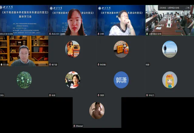2023年6月7日下午,由西北大学公共管理学院主办,陕西省民政厅养老服务处协办的“《关于推进基本养老服务体系建设的意见》集体学习会”在我院召开。会议由西北大学公共管理学院院长雷晓康教授主持,采取线上线下同步的方式进行。陕西省民政厅养老服务处处长高静、民政厅养老服务处干部石智、西北大学公共管理学院教授许琳、西北大学公共管理学院副教授聂建亮、西北大学公共管理学院副教授吴玉锋、西北大学公共管理学院讲师杨波、陕西君颐健康养老服务有限公司总经理杨琨、陕投康养投资运营有限公司负责人晋阳以及西北大学公共管理学院的相关学者及博硕士生等三十余人参加了本次会议。