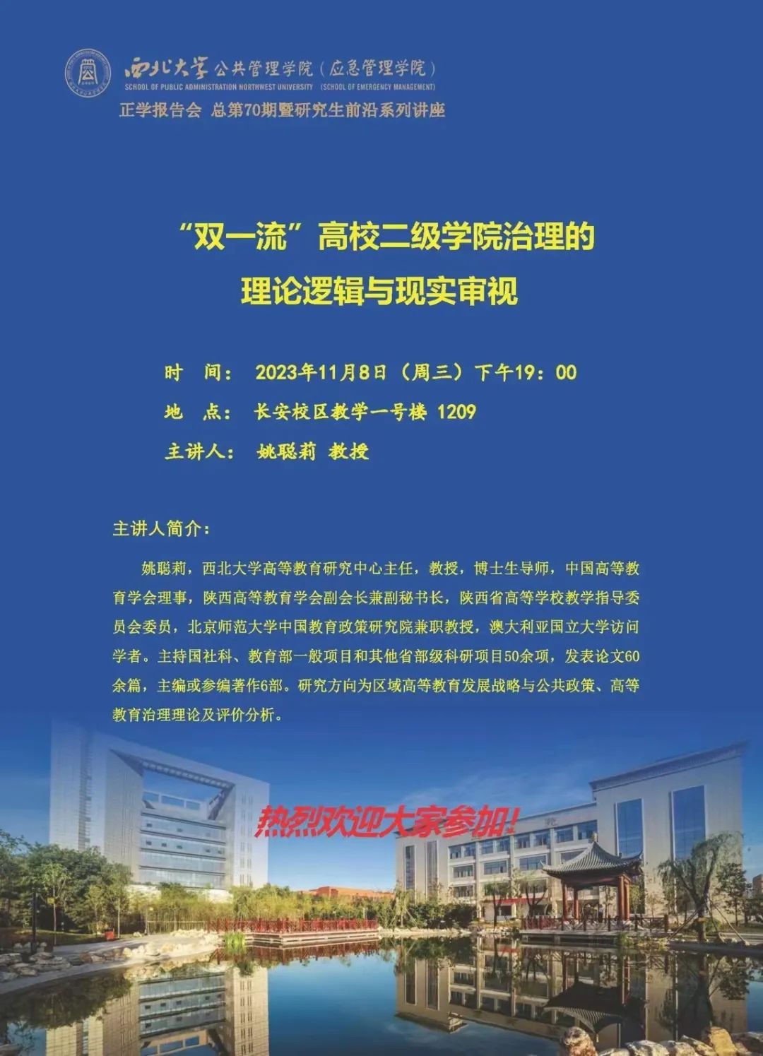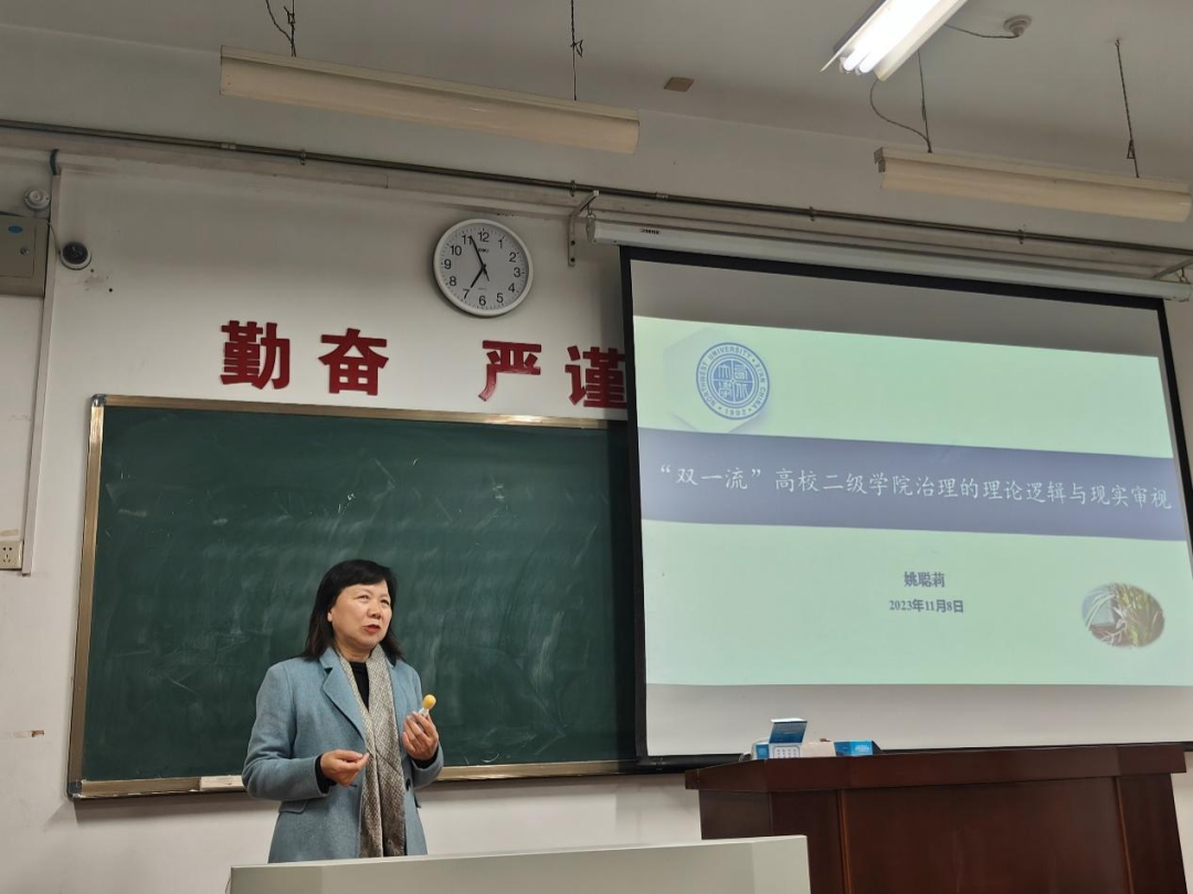 2023年11月8日晚,西北大学公共管理学院姚聪莉教授在长安校区教学一号楼1209教室为我院2023级全体硕士研究生作了题为“‘双一流’高校二级学院治理的理论逻辑与现实审视”的专题讲座。