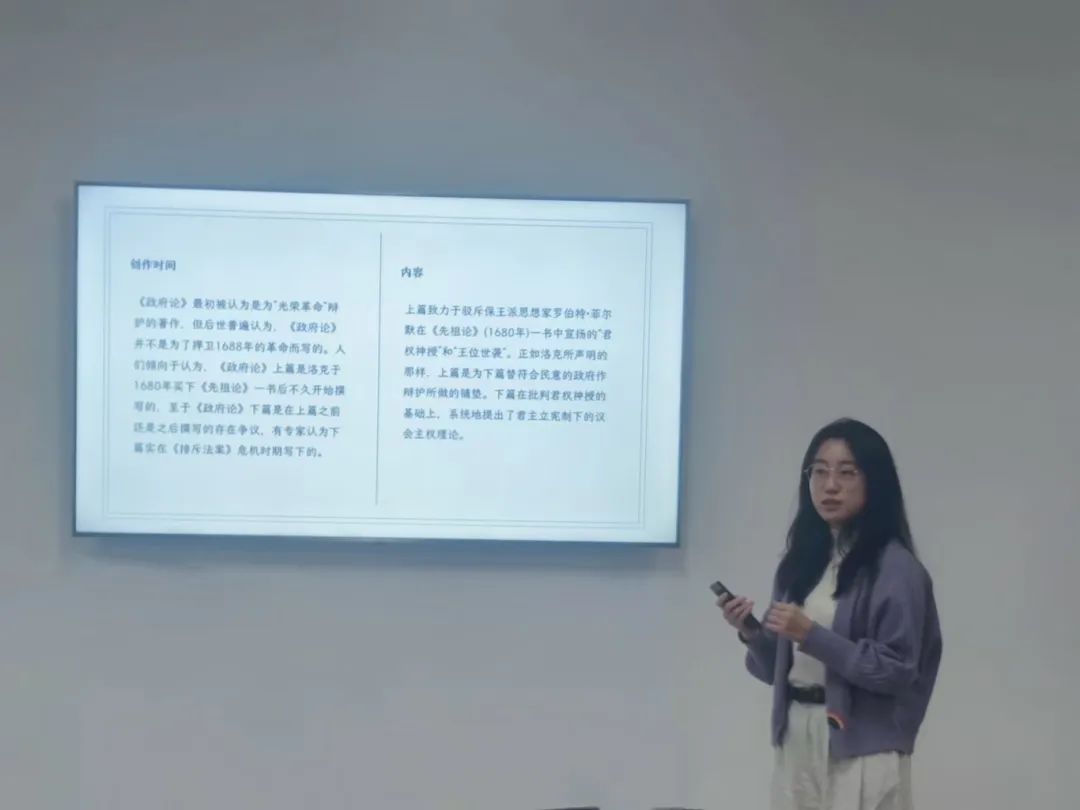 2023级行政管理硕士研究生杨静分享的书籍是约翰洛克的《政府论》。她从背景简介、内容逻辑、思考感悟三个方面展开。约翰·洛克是英国启蒙运动的代表人物之一,思想理论根植于其所处的时代环境。《政府论》从结构上可大致分为上下两篇,两篇的基本精神在于对英国“光荣革命”进行辩护和理论总结。在《政府论》上篇中,洛克通过对其时保皇派观点及其理论依据进行考察和批判,着力驳斥了君权神授说和王位世袭论,对于从理论上摧毁专制主义、论证资产阶级革命与新制度的合法性具有重要意义。下篇则试图以自然法学说来说明国家的起源和本质问题,从自然状态、社会契约、分权制衡和政府终结四个方面详细论述,正面阐述了洛克关于议会制度的政治理论。从影响上看,《政府论》对资产阶级政治思想形成与发展曾产生很大的影响,对英国政治、经济的发展起到了巨大的推动作用。