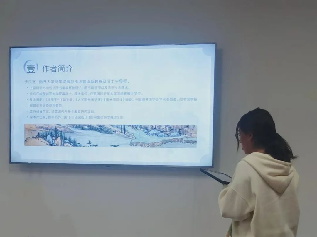 2023级图书馆学专业硕士研究生马瑜菡分享的书籍为于良芝的《图书馆学导论》。在此次读书会上,马瑜菡详细分享了《图书馆学导论》一书的核心内容,并结合自身的学习体会进行了深入的探讨。该书围绕图书馆学的哲学基础、职业精神及学科发展进行了全面的分析。马瑜菡首先介绍了作者于良芝教授的学术背景,并阐述了图书馆学学科在国内外发展过程中所面临的挑战与机遇。接着指出,《图书馆学导论》中的重要理论框架包括DIKW模型(数据、信息、知识、智慧)以及从图书到图书馆再到图书馆学的逻辑进路。这些理论为图书馆职业精神的实践提供了坚实的基础,使得该书在图书馆学教育中具有重要的参考价值。