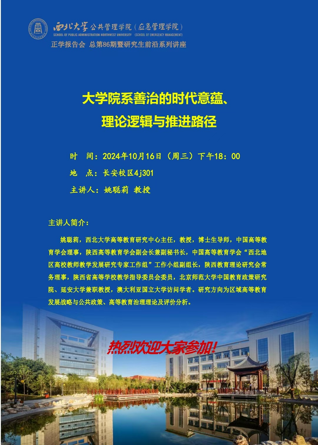 2024年10月16日晚19:00,西北大学公共管理学院姚聪莉教授在4J301教室为我院2024级全体硕士研究生作了题为“大学院系善治的时代意蕴、理论逻辑与推进路径”的专题讲座。