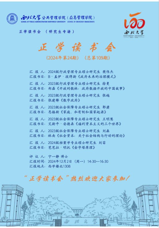 2024年12月2日,我院在西学楼北1308举办了2024年第24期正学读书会(总第109期)。西北大学公共管理学院2024级行政管理专业硕士研究生樊伟杰、2023级行政管理专业硕士研究生徐曼、2023级行政管理专业硕士研究生张越、2023级社会保障专业硕士研究生郭潇、2023级社会保障专业硕士研究生王明慧、2023级社会保障专业硕士研究生刘淼和2024级档案学专业硕士研究生刘苗分别作为主讲人进行读书汇报,公共管理学院2024级博士研究生宁一静担任评议人,部分研究生旁听了此次报告会。
