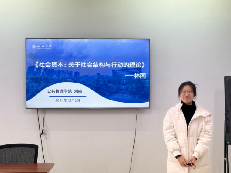 2023级社会保障专业研究生刘淼分享了林南所著的《社会资本:关于社会结构与行动的理论》一书。她从社会资本概述、书籍主要内容、个人学习思考三个方面展开。在正式交流书籍内容前,刘淼先介绍了社会资本的发展历史、概念界定及其影响,简要勾勒出了社会资本的全貌。接着,她详细讲解了书籍的内容架构和主要思想。书中从促进信息流动、对代理人施加影响、确定“社会信用”以及强化身份和认同感四个方面分析了社会资本的运作方式。此外,还从个体与群体的角度探讨了社会资本的获取与使用,指出资源是社会资本的核心,资源、等级制与社会网络共同构成了社会资本的社会基础,回答了“资源是如何嵌入在集体中”的问题;资源、动机与互动构成了社会资本的行动基础,解答了“资源是如何激活的”这一疑问。最后,她对汇报内容进行总结,并联系实际生活,分享了自己阅读本书的收获。