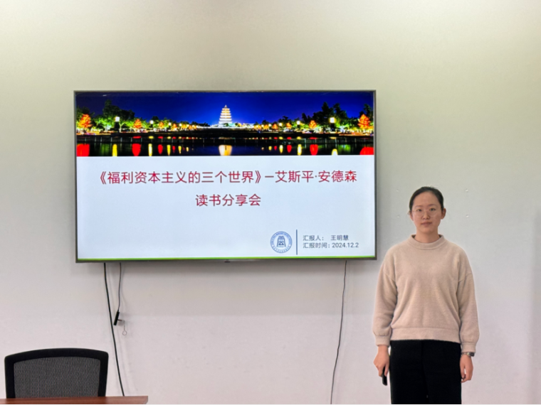 王明慧同学分享的书籍是考斯塔·艾斯平·安德森的《福利资本主义的三个世界》,她首先对作者考斯塔·艾斯平·安德森进行了简要介绍,强调了他在社会政策、福利国家研究以及劳动市场等领域的广泛影响力。随后,她深入剖析了《福利资本主义的三个世界》一书的核心内容。她指出,安德森将福利国家分为三种模式:自由主义模式、社会合作-保守主义模式和社会民主主义模式,分别以盎格鲁-撒克逊国家、欧洲大陆国家和斯堪的纳维亚国家为代表。她强调,安德森的理论框架通过“去商品化”和“社会分层化”两个概念,为理解福利制度如何塑造社会结构提供了新的视角。王明慧同学还对安德森的理论进行了批判性思考,指出了其在性别维度、福利国家之外的地区以及动态分析方面的局限性。她认为,尽管存在争议,安德森的三分法仍然是理解不同福利国家模式优缺点的重要工具,对于我国社会福利制度的完善具有重要的借鉴意义。最后,评议人对王明慧同学的分享进行点评。她指出,《福利资本主义的三个世界》是社会保障专业里面的经典著作,对各个国家社会福利政策制定具有非常重要的参考价值,如何将其借鉴应用到我国的政策完善值得深入思考和研究。