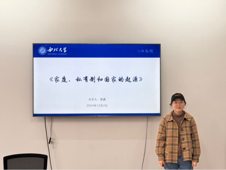 2023级社会保障专业研究生郭潇分享书目是弗里德里希·恩格斯所著的《家庭、私有制和国家的起源》。郭潇同学从写作背景、作者简介、内容分享和全书总结四部分展开她的分享。她从古代社会概况、家庭形式演变、氏族-父权制-国家产生及社会组织形式的演变四部分对本书行文脉络进行梳理,认为文明的进程、社会组织形式的演进都受制于原始公有制到私有制的转变,“经济基础决定上层建筑”这一朴素的思想始终贯穿全书。在内容分享部分,她着重向大家介绍了野蛮时代至文明时代出现的三次社会大分工,由社会分裂产生的奴隶制、私有制、阶级出现与分化加剧最终影响到氏族制度的解体、母权制向父权制的转变、国家的形成和发展等重要变革。郭潇同学细致阐述分析了家庭形式演变的潜在逻辑与国家的阶级本质,说明国家最终灭亡的客观规律。