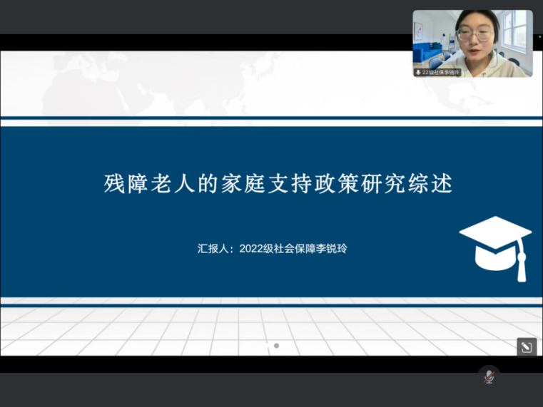 2022级社会保障专业硕士研究生李锐玲同学的汇报题目为《残障老人的家庭支持政策研究综述》。李锐玲同学首先从背景层面分析了研究残障老人家庭支持政策的必要性。她指出,在我国人口老龄化及家庭规模小型化和核心化的背景下,探索残障老人家庭支持政策,有利于发挥家庭的基本功能,提升家庭照料能力。接下来她主要从残障老人的概念界定、特征及需求,残障老人的家庭支持及残障老人对家庭的影响,家庭政策的概念、类别及特征,残障老人家庭支持政策的相关研究及政策建议这四个方面展开进行讲解。最后,她对文献做出述评,指出目前国内学者关于残障老人的概念界定依旧不清晰,且残障老人的家庭政策仍然以补缺性政策为主,以家庭为中心的非正式支持体系的构建依旧较为欠缺。