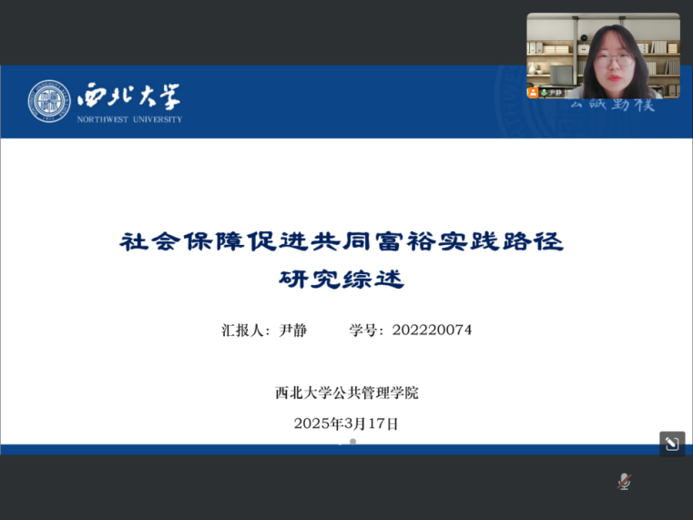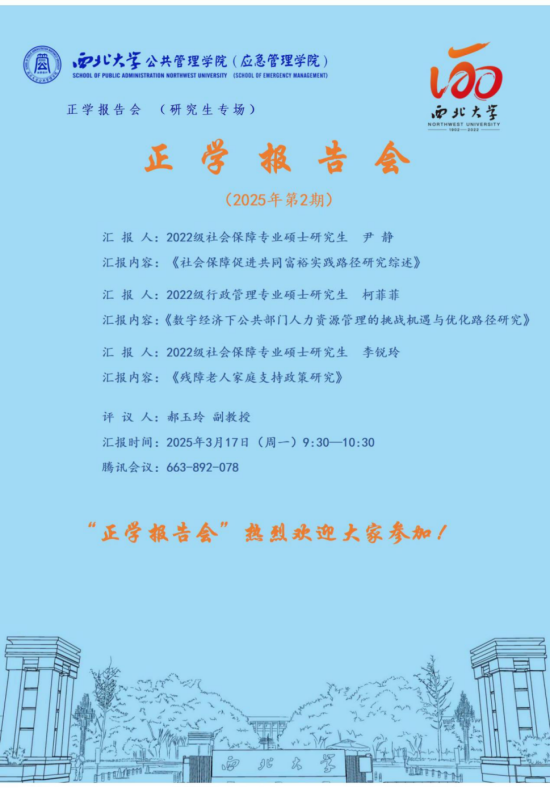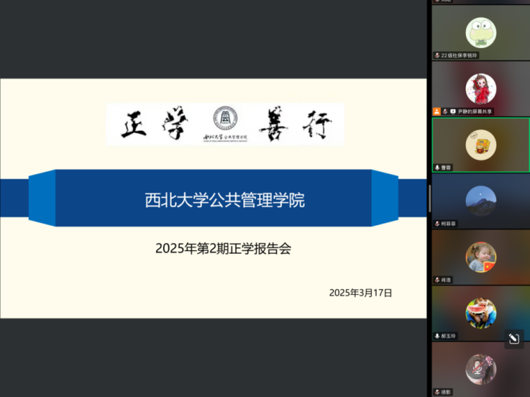 2025年3月17日上午,我院于线上举办了2025年第2期正学报告会。西北大学公共管理学院2022级社会保障专业硕士研究生尹静、2022级行政管理专业硕士研究生柯菲菲、2022级社会保障专业硕士研究生李锐玲分别作为主讲人进行专题学术汇报,郝玉玲副教授担任评议人,部分研究生旁听了此次报告会。
