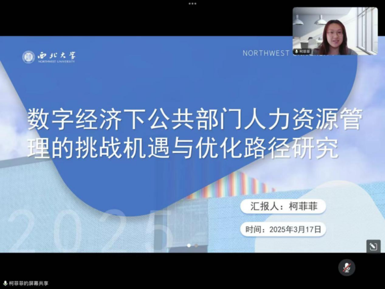 2022级行政管理专业硕士研究生柯菲菲的汇报题目为《数字经济下公共部门人力资源管理的挑战机遇与优化路径研究》。她主要从引言、数字经济时代公共部门人力资源管理的理论基础、数字经济为公共部门人力资源管理带来的机遇、面临的挑战、优化路径及结论与展望六个方面展开讲述。首先,她指出公共部门作为国家治理的重要主体,在数字经济的浪潮下,其人力资源管理也面临着深刻变革。其次,她对数字经济和公共部门人力资源管理的概念进行界定,并简要阐释数字经济对公共部门人力资源管理的影响机制。紧接着,她梳理了数字经济为公共部门人力资源管理带来的机遇、面临的挑战,如提升管理效率、优化人才配置、管理模式转型困境、组织文化与变革阻力等。最后,她提出应从技术、管理模式、人才队伍建设、组织文化等方面进行优化。